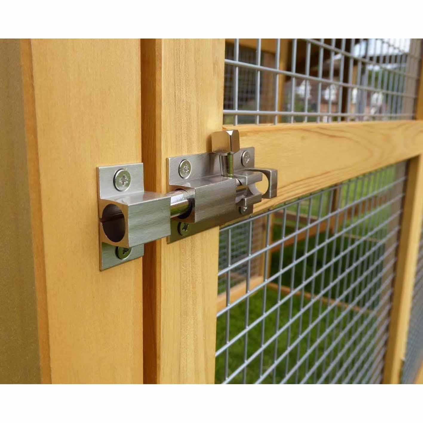 The large front door of the run allows adults and children to gain easy access at any time. Each of the 4 doors to the Sussex and Run is fitted with a solid brass-metal brushed chrome finish lock.